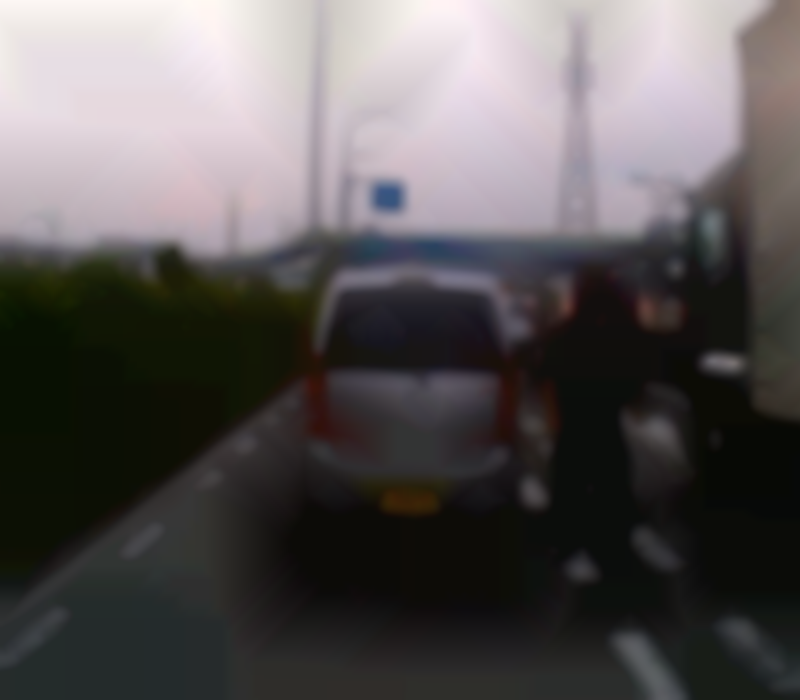 運転手の男が道路上で車から降りてこちらに来たが、すぐ戻った。 60km/h制限の場所を20km/h程で走っていて、完全に停止した時もあった。 ミラー越しに目が合った。