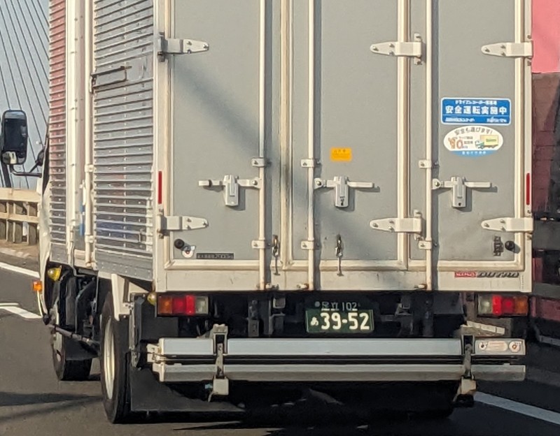 4トン箱車のトラックが道路の真ん中で交通を妨げて長時間停車していました。ドライバーはトラックから離れ配送センターの受付に行っていました。