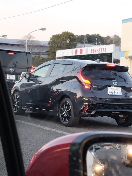 白いアクア。交差点近くでウィンカー出さず、急なレーン変更。急ブレーキで何とか当たらずに済んだが危険すぎる。